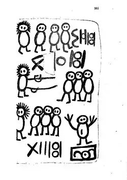 The French missionary Emmanuel Domenech's work Manuscrit pictographique américain, précédé d'une notice sur l'idéographie des Peaux Rouges (Paris, 1860) was the result of an unintentional hoax.[2] The German orientalist Julius Petzholdt declared that the manuscript consisted only of scribbling and incoherent illustrations in a local German dialect. Domenech maintained the authenticity of the manuscript in a pamphlet entitled La vérité sur le livre des sauvages (1861), which drew forth a reply from Petzholdt, translated into French (by Philippe Van der Haeghen) under the title of Le livre des sauvages au point de vue de la civilization Française (Brussels, 1861).