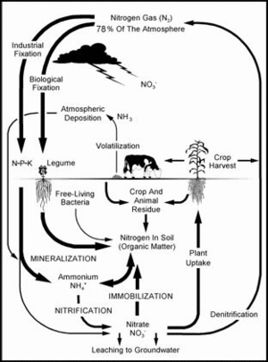 Nitrogen is a common element in nature and an essential plant nutrient. Approximately 78% of Earth's atmosphere is nitrogen (N2). The strong bond between the atoms of N2 makes this gas quite inert and not directly usable by plants and animals. As nitrogen naturally cycles through the air, water and soil it undergoes various chemical and biological transformations. Nitrogen promotes plant growth. Livestock then eat the crops producing manure, which is returned to the soil, adding organic and mineral forms of nitrogen. The cycle is complete when the next crop uses the amended soil.[1] To increase food production, fertilizers, such as nitrate (NO3–) and ammonium (NH4+), which are easily absorbed by plants, are introduced to the plant root zone. However, soils do not absorb the excess NO3– ions, which then move downward freely with drainage water, and are leached into groundwater, streams and oceans.[2] The degree of leaching is affected by: