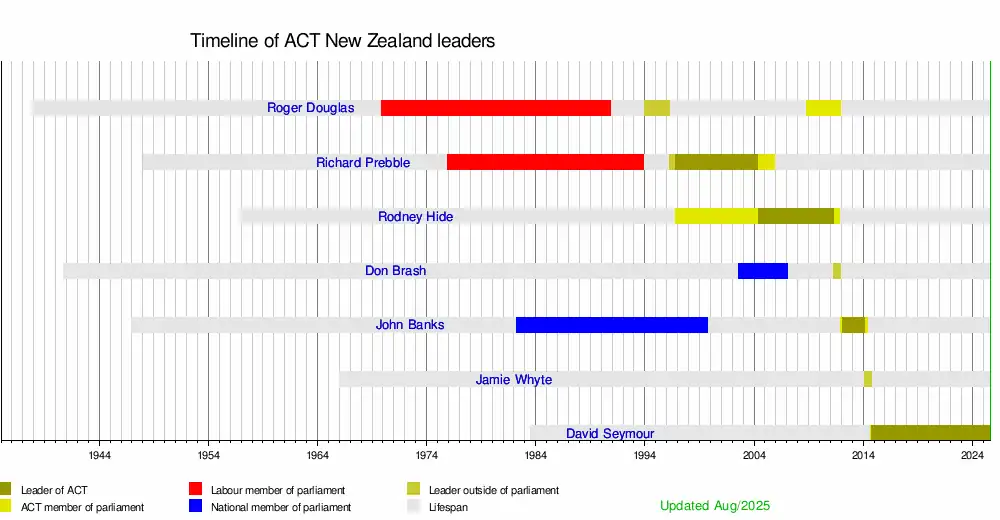 The leader of ACT New Zealand is the highest-ranked political position within ACT New Zealand. The current leader is David Seymour, who became the leader in October 2014. He is the longest serving Act Leader, serving more than 10 years as of 2024.