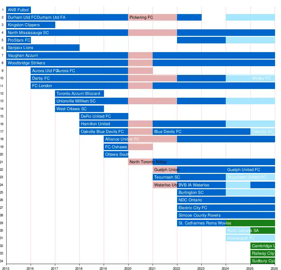 Blue Devils FC[note 1] | Oakville | Sheridan Trafalgar Stadium | 2018 | ||