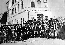 Clashes continued within the party between leftists and centrists – the latter favouring pursuit of reforms through a parliamentary system. The leftist faction prevailed at the second congress held in Vukovar on 20–24 June 1920 and adopted a new statute.[16] That aligned the party entirely with the Communist International (Comintern),[17] implementing all instructions received from the Comintern.[18] Furthermore, the party was renamed the Communist Party of Yugoslavia (Komunistička partija Jugoslavije, KPJ) to allow its membership in the Comintern.[19] Filip Filipović and Sima Marković, both former SSDP activists, were elected to lead the KPJ. By May 1920, the KPJ had about 50,000 members,[20] and numerous sympathisers largely drawn from among 300,000 members of trade unions and youth organisations.[21]