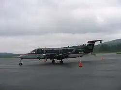 In 1964, Northeast was operating direct one stop service to New York John F. Kennedy Airport with four engine Douglas DC-6B propliners via Keene.[12] By 1969, Northeast was operating up to ten flights a day from the airport with Fairchild Hiller FH-227 turboprop aircraft with nonstop service to New York LaGuardia Airport (LGA), Boston (BOS), Montpelier/Barre (MPV), Manchester, NH (MHT), and Keene, NH (EEN) with daily direct one stop service to Burlington (BTV).[13] Northeast was merged into Delta Air Lines in 1972 which in turn continued to serve the airport.