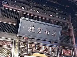 Lecheng Temple has three central halls and two long halls running down the sides. In the main hall, Mazu sits in the center accompanied by Guanyin and Zhusheng Niangniang on the sides; the surrounding halls contain other deities as well. The temple is also decorated with elaborate wooden sculptures by Cheng Ying-shan, one of the most celebrated woodworkers of his era. In the main hall, there is a Qing dynasty wooden plaque (bian'e) inscribed with Fǎyǔ Hóngshē (法雨宏施) that was created by Liu Chun-lin, who is remembered as the last zhuangyuan in Chinese history.[2][4][6]