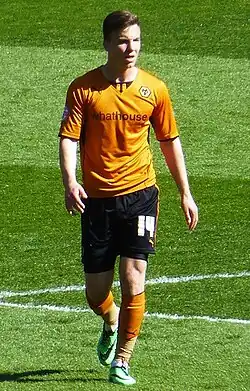 The midfielder made his club and Football League debut on 3 August 2013 in a goalless draw against Preston North End.[12] He scored his first goal for the club a week later when he netted in a 4–0 win against Gillingham.[13] He made 28 appearances during his first full season at Wolves, helping the team on to win the 2013–14 Football League One title.[14]