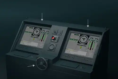 The US Navy's Integrated Bridge and Navigation System (IBNS) uses two touchscreens and steering wheel for steering. The helm is on the left, and the lee helm is on the right.
