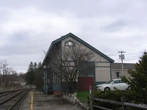 The station was built in 1893 by the Housatonic Railroad shortly before it was absorbed by the New York, New Haven and Hartford Railroad (NYNH&H). It served as a combination station, serving both passengers and freight. In peak mid-20th century years of passenger service, the Berkshire, Housatonic, Litchfield, Mahaiwe, Mahkeenac, Taconic, Umpachanee, and unnamed trains made stops at the station on trips between New York City and Pittsfield.[3] Passenger service ended in 1971 and freight service ended in 1973. The railroad played an important role in the town's economy, bringing its manufactured goods (principally paper) and raw materials to market, and bring vacationers to the area's summer estates and boarding houses. It was the busiest station on the line between the major stops of Pittsfield, Massachusetts and Bridgeport, Connecticut.[2]