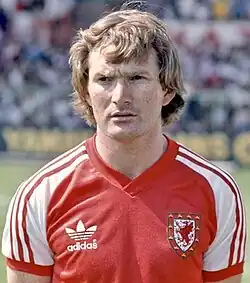 In 1971, he won his first international cap, aged 18, against Czechoslovakia at Letenský Stadion in Prague in a 1–0 defeat.[12] His first international goal was in a 2–0 victory against Poland at Ninian Park in Cardiff in March 1973.[13] In May 1977, he scored the only goal of the game, a penalty, in a defeat of England, in the British Home Championship at Wembley, their only win against England in England.[5] He also captained the team, making his first appearance as captain against Iceland at Vetch Field, Swansea, in October 1981.[12] He played 54 times for Wales, scoring ten goals.[5]
