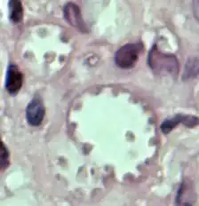 Leishmania mexicana in a biopsy specimen from a skin lesion stained with H&E. The amastigotes are lining the walls of two vacuoles, a typical arrangement. The species identification was derived from culture followed by isoenzyme analysis. | |