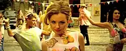 An accompanying music video for "Lemonade" was posted onto the YouTube channel of Stan's label, Maan Studio, on 4 June 2012[18] after it was previewed one day before.[19] It was shot by Iulian Moga in April 2012[19] at the MediaPro Pictures studios in Buftea, Romania.[4][5] The clip commences with Stan entering a kitchen wearing a red-white striped dress.[6] Subsequently, she is portrayed cutting lemons and making lemonade, following which she makes a phone call and walks down the street sporting a lemon-printed yellow dress and smiling into the camera. Next, Stan is seen singing in front of a red car, flirting with a man, which is followed by the appearance of two police men. They enter a store and the singer is presented selling lemons in the street. Afterwards, the video switches from color to sepia, as she is present at a block party; it closes with Stan posing in front of a backdrop designed with different types of shoes.[18]