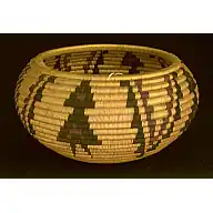 Lena was known for her incredibly tight weaves during what is referred to as the "fancy basketry" period of Washoe art.[4] For the Washoe tribe, basket weaving has served as a practical and artistic purpose for centuries.[4][5] Because of the arid weather of the region of Nevada and California where they lived, the Washoe people had to remain mobile, and these woven baskets, known as degikup, were a lightweight and durable way to transport goods during these transitory periods.[5][6] The baskets are built from young willow shoots, fern roots for black designs, and western redbud (Cercis occidentalis) for red designs.[4][5] To create the basket requires an awl, knife, and a container of water to soak and soften the fibrous plant matter.[5] Different designs were used to indicate stories, histories, or various messages.[5][7]