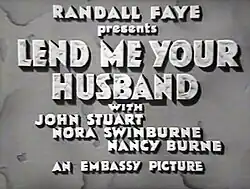 Lend Me Your Husband is a 1935 British comedy film directed by Frederick Hayward and starring John Stuart, Nora Swinburne and Nancy Burne.[1] It was made at Walton Studios as a quota quickie.