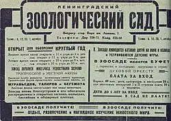 The Leningrad Zoo (Russian: Ленингра́дский зоопа́рк), sometimes called the Saint Petersburg Zoo or Sankt-Peterburgskiy Zoopark (Russian: Санкт-Петербу́ргский зоопа́рк), in Saint Petersburg (formerly Leningrad), Russia, is located in Alexander Park in the Petrogradskaya Storona. It was founded by Sofia Gerhardt and Julius Gerhardt in 1865.[1] It has about 2,000 animals from 410 species, including polar bears.[2] It is one of the oldest zoos in Russia, as well as the most northernly.