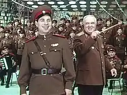 From 9 November 1953 to March 1965 he was a member of the choir in the Red Song and Dance Ensemble of the Soviet Army (later the Alexandrov Ensemble). His place in the choir was always third from the right in the top row. From 1953 to 1955 he served in both the Red Army and the choir. From 1956 to 1959, while still with the choir, he studied at Gnessin State Musical College. His first unofficial public performance as soloist was in the State Kremlin Palace on 18 March 1965. On that day two good friends of his, cosmonauts Pavel Belyaev and Alexei Leonov, traveled into space on the Voskhod 2. During this mission, Leonov became the first human to walk in space. Kharitonov's first official public performance as a soloist was on 22 April 1965.[4] In 1967 he was awarded Honoured Artist of Russia. He continued with the Ensemble until 1972 - so he was with them for nearly 20 years.[1][2][3] B.A. Alexandrov was proud of his soloist, and would often shake his hand or hug him publicly onstage after a performance.[5] Kharitonov sometimes sang duets, but only with Ivan Bukreev.[6] Kharitonov had only one singing teacher in his life: Evgeny Avgustovich Kanger, who taught no-one in the Ensemble but the leading soloists, including Evgeny Belyaev.