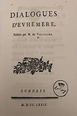 - ^ Livre Dialogues d'Evhémère / par M. de Voltaire. Réseau des bibliothèques de Suisse occidentale. 1779. Retrieved 9 November 2018.