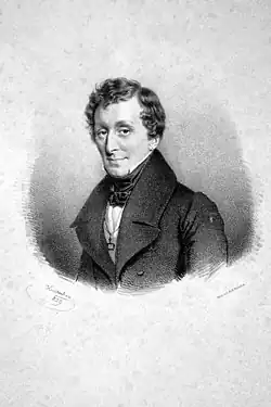 Les Huguenots was some five years in creation. Meyerbeer prepared carefully for this opera after the sensational success of Robert le diable, recognising the need to continue to present lavish staging, a highly dramatic storyline, impressive orchestration and virtuoso parts for the soloists – the essential elements of the new genre of Grand Opera. Meyerbeer and his librettist for Robert le Diable, Eugène Scribe, had agreed to collaborate on an epic work concerning the French Wars of Religion, with a drama partly based on Prosper Mérimée's 1829 novel A Chronicle of the Reign of Charles IX.[2] Coming from a wealthy family, Meyerbeer could afford to take his time, dictate his own terms, and to be a perfectionist. The very detailed contract which Meyerbeer arranged with Louis-Désiré Véron, director of the Opéra, for Les Huguenots (and which was drawn up for him by the lawyer Adolphe Crémieux) is a testament to this.[3] While Meyerbeer was writing the opera, another opera with a similar setting and theme (Le pré aux clercs by Ferdinand Hérold) was also produced in Paris (1832). Like Meyerbeer's, Hérold's work was extremely popular in its time, although it is now only seldom performed.
