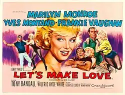 Let's Make Love is a 1960 American musical comedy film made by 20th Century Fox in DeLuxe Color and CinemaScope. Directed by George Cukor and produced by Jerry Wald from a screenplay by Norman Krasna, Hal Kanter and Arthur Miller, the film stars Marilyn Monroe, Yves Montand and Tony Randall. It would be Monroe's last musical film performance. Not long before she died in 1962, Monroe commented that the role of Amanda was the worst in her career. In her opinion, there was "no role...that you had to wrack your brain...there was nothing there with the writing" and that it had "been part of an old contract." Arthur Miller was also critical of the film, stating that despite his efforts to improve the script it was "like putting plaster on a peg leg."[2] During an interview with David Letterman in 1988, Montand acknowledged his difficulties with the script and his problem speaking English, but said it was an honor to work alongside Marilyn Monroe.[3]