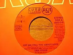 "Let Me Tell You About Love" is a song written by Carl Perkins, Paul Kennerley and Brent Maher, and recorded by American country music duo The Judds. It was released in June 1989 as the second single from the album River of Time. The song was The Judds' fourteenth and final number one on the country chart. The RCA/Curb single, 8947-7-R, b/w "Water of Love", went to number one for one week and spent a total of fifteen weeks on the country chart.[1] The record also reached number one on the Canadian RPM Country Tracks chart.