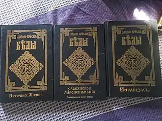 Levashov claimed to be a bearer of genuine "Vedic" sacred knowledge of the "Slavic Aryans",[12] and called on his followers to live in rational harmony with nature following the path of evolution represented by ancient Vedic culture.[13] Levashovism is based on the Book of Veles and on the Slavo-Aryan Vedas first popularised by the Ynglist Church in the 1990s;[14] Levashov reworked the teachings of these books into original publications, including some—such as The Tale of the Bright Falcon—presenting such teachings in the style of the Russian fairy tale.[15] Levashov referred to the Slavo-Aryan Vedas as carriers of the "innermost knowledge of the first ancestors".[6]