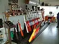 To assist the operator in determining their functions, each lever in a frame will generally be uniquely labelled, one common method being to number the levers in order from left to right. A lever's identification may be painted on its side or engraved on a badge or plate fitted either to the lever or behind it. This may be accompanied by a description of the lever's function. Usually, a large track diagram is positioned within easy view of the operator, which clearly shows each lever number adjacent to symbols representing the items of equipment that they operate. Levers are commonly coloured according to the type of equipment they control, the code of colours varying between different railway administrations. For example, in British practice, the following code generally applies: a red lever controls a stop signal or shunt signal, a yellow lever controls a distant signal, a black lever controls a set of points, a blue lever controls a facing point lock, and a white lever is spare. Brown levers are used to lock level crossing gates. Lever handles are usually of polished, unpainted steel, and signalmen operate them with a cloth to prevent rusting from the sweat on their hands.[4] In Germany, signal levers are red, whilst levers for points and track locks are usually blue, and route lock levers are green. Also, individual numbers and letters are used to indicate each individual item a lever operates in Germany as well.[3]: 126