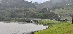 State Route 17 runs alongside the dam's western edge and over part of the reservoir. Alma Bridge Road (Limekiln Canyon Road) runs around the eastern side, connecting with 17 at the north end and again at the south end via other surface streets.