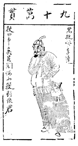 A native of Baizhang Village (百丈村) in Yishui County (in present-day Linyi, Shandong), Li Kui flees from home after killing a person by accident. He ends up in Jiangzhou (江州; present-day Jiujiang, Jiangxi), where he becomes a jailer under the chief warden Dai Zong. He gets to know Song Jiang, who was exiled from Yuncheng for killing his mistress Yan Poxi. Li Kui draws the attention of Song, who was dining with Dai in an inn, when he threatens the keeper of the inn to lend him money. Song and Li take to each other as one appreciates utmost forthrightness and the other unstinting generosity. As they are having a meal, Song Jiang suddenly craves for fish. As the fish at the restaurant is not fresh, Li Kui volunteers to get some from the riverside market. Impatient to wait for the chief fishmonger Zhang Shun to come, he tries to snatch some fish from their cages but inadvertently releases them into the river. Zhang arrives and fights Li Kui. Li Kui beats Zhang Shun easily, but the fishmonger lures him onto a boat, which he then overturns, causing Li Kui to fall into the water. Li, a non-swimmer, is continuously dragged down under water by Zhang. Luckily, Song Jiang and Dai Zong comes to the scene to stop the fight. After this event, the four become friends.