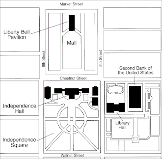 INHP's next plan was to build a Bell pavilion at the north end of Independence Mall, on the block bounded by Race, Arch, 5th and 6th Streets (now the site of the National Constitution Center). This would have placed the Bell about a quarter-mile from Independence Hall. INHP's second plan was also soundly rejected.