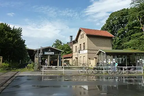 In 1892, a second track was built and the two-storey, yellow brick station building was built north of Bahnhofstrasse. The station offices were on the ground floor of the unadorned functional building and upstairs there was the stationmaster's apartment. A house for rail officials was built to its north in the same style and between the two there was single-storey building with commercial space and toilets.[4]