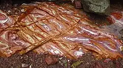 Liesegang rings (/ˈliːzəɡɑːŋ/) (also called Liesegangen rings or Liesegang bands) are colored bands of cement observed in sedimentary rocks that typically cut across bedding.[1][2] These secondary (diagenetic) sedimentary structures exhibit bands of (authigenic) minerals that are arranged in a regular repeating pattern.[3] Liesegang rings are distinguishable from other sedimentary structures by their concentric or ring-like appearance. The precise mechanism from which Liesegang rings form is not entirely known and is still under research,[4] but there is a precipitation process that is thought to be the catalyst for Liesegang ring formation, referred to as the Ostwald-Liesegang supersaturation-nucleation-depletion cycle.[5] Though Liesegang rings are considered a frequent occurrence in sedimentary rocks,[6] rings composed of iron oxide can also occur in permeable igneous and metamorphic rocks that have been chemically weathered.[7]