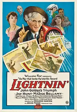 Lightnin' is a 1925 American silent comedy film directed by John Ford.[1] It was based on a successful play of the same name. The original run of the play started in 1918 at the Gaiety Theatre and continued for 1,291 performances, breaking the record for longest running play at that time.[2][3] The film was remade in 1930 by Henry King for Fox as an early talkie starring Will Rogers with support from Louise Dresser and Joel McCrea.