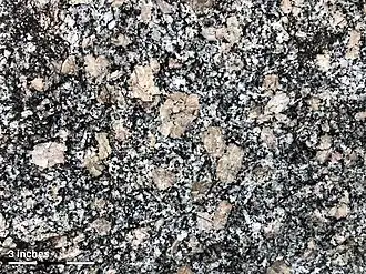 During the late Precambrian-early Cambrian, there was an accumulation of felsic volcanic rocks and argillite, a fine grained sedimentary rock. Regional metamorphism took place during the Paleozoic, along with compression of the area which resulted in an anticline. The original rocks were then intruded by the Lilesville Granite, which crystallized in place as the country rock was metamorphosed by the heat of the magma intrusion. This resulted in the formation of the contact aureole.[6] Mica gneiss xenoliths of various sizes can be found throughout the granite, especially near the contact with the aureole.[3] The Lilesville Granite was then intruded by the Pee Dee Gabbro, which can be confirmed by the presence of granite xenoliths in the gabbro.[1] During the Triassic, a system of normal faults including the Jonesboro fault cut through the area[7] and a period of sedimentation followed[8] and deposition of clastic rocks such as conglomerates, sandstones, and siltstones occurred. Then several dolerite dikes, thought to be late Triassic or Jurassic in age, intruded into the Lilesville Granite. The Lilesville Granite has been heavily weathered and is often covered by sediment where it outcrops.[3]