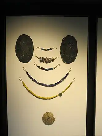 Other objects from Lilleberge include a pair of copper alloy oval brooches, necklaces made of coloured glass beads, a spindle-whorl, a gilded Celtic mount (that was only recently discovered in the British Museum's stores[3]), an iron pot stand, rivets from a Viking boat and skeletal remains from the deceased.