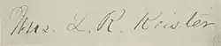 Lillian (nicknames, "Lillie" or "Lizzie") A. Resler[a][b][c] was born in Mount Pleasant, Pennsylvania, May 15, 1851. She was the first of seven children born to Rev. and Mrs. Jacob B. Resler. A brother was named John I.L. Ressler.[5] Rev. Resler (d. 1891) was minister of the United Brethren in Christ church of that city.[8] He, with only a small salary, moved to Westerville, Ohio, to give his children the benefit of Otterbein University, as soon as Keister was ready to enter, which was in 1866. She was graduated with the class of 1872.[9][10]