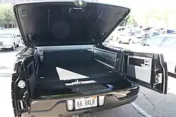 In another major design change, the rear cargo bed was repurposed as a watertight trunk,[10] adopting a permanently mounted tonneau cover (power-operated), opening above a 50/50 hinged door (replacing a tailgate). The interior of the Blackwood cargo area was fully carpeted, lined in polished aluminum, and lit with LED lighting.[6] While far smaller in interior size than a similar-length F-150 cargo bed, at 26 cubic feet (740 dm3),[11] the cargo area of the Blackwood was larger than the trunk of the Lincoln Town Car (itself, the highest-capacity sedan produced at the time).