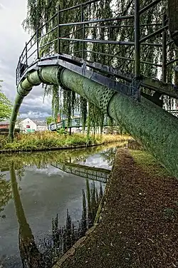 A ceremony to mark the start of the scheme was held on 24 October 1908, when 50 people travelled to Elkesley. Bishop E. King prayed for the success of the venture, the mayor, Councillor J. H. Mills used a silver spade to cut the first sod, and the party retired to the Hop Pole pub at Ollerton when torrential rain began to fall. The first borehole was cut to a depth of 570 feet (170 m), and when pumping tests proved successful, three further boreholes were cut. All had been finished by September 1909. Work on the pumps and buildings was then started.[22] Delivery of materials for the project was aided by the construction of a 3-mile (4.8 km) siding from near Checker House railway station to the borehole site. This was used to deliver two triple expansion steam engines, three Lancashire boilers, the pumps for the four boreholes, and materials for construction of the buildings.[23] Bower Brothers of West Bridgford were awarded the contract to lay 22 miles (35 km) of pipeline from Elkesley to Lincoln. The route followed the Great North Road, now the A1 road, southwards to Markham Moor, and then followed the A57 road to Lincoln. Most of it was made of cast iron pipes, 21 inches (53 cm) in diameter, but where the route crossed rivers or railways, lapped steel was used. A separate contract was awarded to Cleveland Bridge & Engineering Company for the section crossing the River Trent, where the steel pipe was carried on a bridge with six spans, next to the toll bridge at Dunham. They also built a crossing over the Foss Dyke at Saxilby, where the pipe is self-supporting, with an air release valve in the centre, and an access gantry to allow the valve to be serviced.[24] A similar arrangement was used at Odder where the pipeline crosses the River Till, although the rise is much less, because navigable headroom is not required. Because the pipeline followed the contours of the countryside, air release valves were fitted at all the high points.[25]