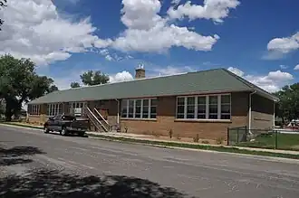 Property was obtained to build a school in 1884 from the Union Pacific Railroad on what was then considered "the wrong side of the tracks." Compared with the earlier East Side School on the good side of town, the West Side School was smaller and plainer. It was a one-story structure with wood siding. In 1924 shortages of classroom space required a new building, designed by architect Wilbur A. Hitchcock. Replacing the 1884 building, it was a one-story brick structure with a green clay tile hipped roof. At its dedication it was renamed the Lincoln School.[2]