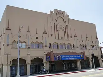 The Lincoln Theater is a historic theater in South Los Angeles, California. The Moorish Revival building was listed on the National Register of Historic Places in 2009. Sometimes referred to as the "West Coast Apollo",[3] the Lincoln Theater was one of the most significant establishments along the Central Avenue Corridor; this became the cultural and business hub of the African-American community in Los Angeles from the 1920s to the 1950s. For more than 30 years, the Lincoln featured live theater, musical acts, talent shows, vaudeville, and motion pictures, including live performances by the leading African-American performers of the era, including Lionel Hampton, Duke Ellington, the Nat King Cole Trio, and Billie Holiday. The Lincoln Theater was managed and directed by Jules Wolf, grandfather of Rock & Roll Photographer, Linda Wolf, [4][5] The theater was converted to use as a church in 1962. It continues to be used for religious services.[6]