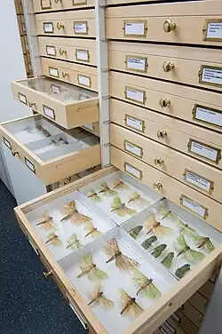 The only university entomology collection in New Zealand, the collection contains over 250,000 pinned insect specimens, including over 70 holotypes and a large collection of specimens in ethanol.[3][8] It is one of the largest and most diverse insect collections in New Zealand, smaller than the National Arthropod Collection at Landcare Research and comparable in size to holdings at Te Papa.[8] The collection is strongest in South Island species, especially from the West Coast and Southern Alps, with collections from the Chatham Islands, Three Kings, and subantarctic islands.[3] Taxonomically, its strengths are:[3][8]