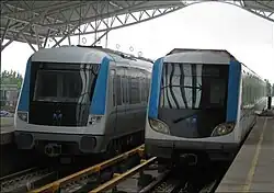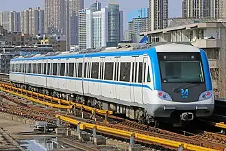 Line 1 of the Wuhan Metro (Chinese: 武汉轨道交通一号线) is an elevated metro line in the city of Wuhan, Hubei. It is the longest continuous metro viaduct in the world. Line 1 opened on 28 July 2004,[1] making Wuhan the fifth city in mainland China to have a metro system after Beijing, Tianjin, Shanghai and Guangzhou.[2] This is the first Metro line in China incorrectly referred to as a light rail (轻轨; qīngguǐ) line in Chinese terminology because it is elevated.[a] Originally a branch line was planned to cross the Yangtze to Wuchang District via the Second Wuhan Yangtze River Bridge.[3] The Second Wuhan River Bridge even had a provision in the central median where Line 1 trains would run in anticipation for the branch line when it opened in 1995. However, by 2003 the reservation was removed to allow for more traffic lanes when the bridge was undergoing renovation.[4]