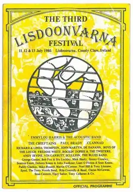Lisdoonvarna was a three-day Irish music festival held each year from 1978 to 1983. Conceived as an Irish folk and traditional music festival, it expanded to include other genres and international artists.[1] The festival was compared to an Irish version of Woodstock[2][3] or Glastonbury.[4] Though successful, violence at the 1983 event and the unrelated drowning deaths of eight festival goers that year led to the event being cancelled after 1983. Attempts were made to revive the festival in 2003 and 2016.