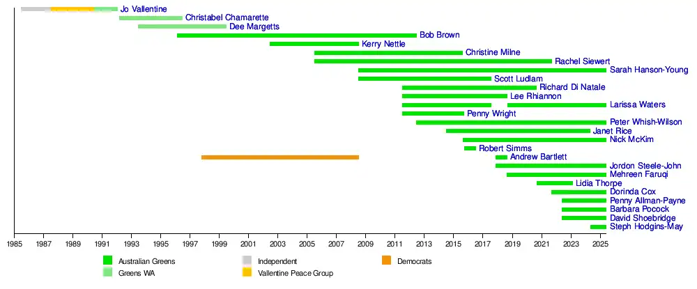 The table below represents the parliamentary representation of Greens politicians from 1983 to the present. Bob Brown was the first elected Greens representative, initially elected to the Tasmanian House of Assembly in 1983. He was joined by Gerry Bates in 1986.