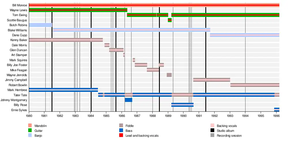 After the four sessions in March 1986, Tate switched back to fiddle while awaiting a permanent replacement, with former stand-in Johnny Montgomery returning as temporary bassist. When a new fiddler couldn't be found, however, Montgomery was made an official member of the BGB.[223] Wayne Lewis left in May 1986 after the longest tenure of any guitarist in the group, replaced by Tom Ewing.[223] The new lineup recorded the final track for their next album, Bluegrass '87, in August.[224] Montgomery left after a final appearance on September 6 to work on his dairy farm; after stand-in appearances by Kenny Jones, Roy Huskey Jr. and Forrest Rose, Tate switched back to bass at the end of the month when Mark Squires was hired as the band's new fiddler.[225] Squires lasted only until mid-November, when he was replaced by Billy Joe Foster.[226] The band's lineup remained stable until the following August, when Foster took a leave of absence and was replaced by Mike Feagan.[227] The new fiddler performed on Monroe's final album for MCA, Southern Flavor, which was recorded during January 1988. Along with Feagan, additional fiddles were performed by returning contributors Buddy Spicher and Bobby Hicks.[228]