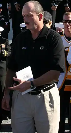 Statistically, Tom Johnson was the most successful head coach, with a winning percentage of .738.[11] He is followed by Harry Sinden, who, averaging his two terms, had a winning percentage of .689.[12] The worst head coach statistically was Phil Watson, who, with a winning percentage of .268, only won 16 out of the 84 games he coached.[13] Claude Julien took over after Dave Lewis was dismissed in 2007.[14][15] Bruce Cassidy succeeded Julien on February 7, 2017, and served as head coach until his firing on June 6, 2022.[16] On June 30, 2022, the Bruins named Jim Montgomery head coach, replacing Cassidy.[17] Following an 8–9–3 start to the 2024–25 season, Montgomery was fired, and replaced on an interim basis by assistant coach Joe Sacco.[18] On June 5, 2025, the Bruins announced that they had hired former player Marco Sturm as their new head coach.[19] Sturm is the first European coach in franchise history, being from Germany.