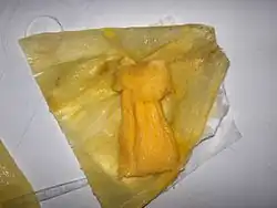 A traditional Brazilian food, it's a paste made from fresh corn and milk, boiled wrapped in corn husks, turned into a dumpling. Variations include pamonha de milho and pamonha de carimã, and some variants use coconut milk. |