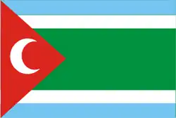 1972-1977 | Flag of The Djibouti Liberation Movement | A Green Field with 2 white stripes, 2 light blue stripes and a red isosceles triangle at the hoist bearing a crescent moon in its center. | |