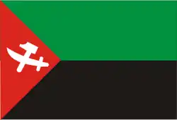 1960-1994 | Flag of The National Union for Independence | A horizontal bicolour of green and black, with a red isosceles triangle at the hoist bearing a sword and a hammer in its center. | |