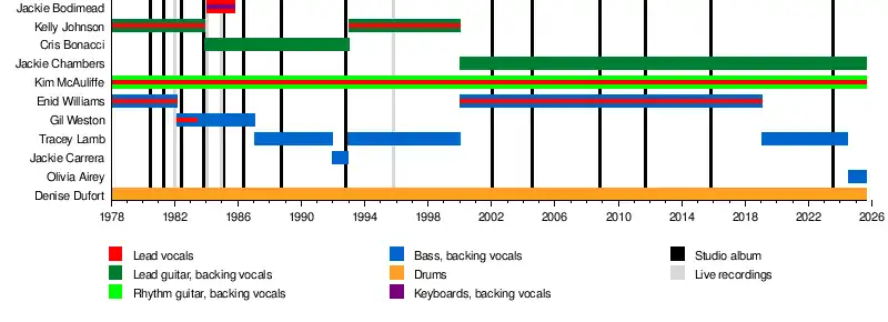 In 1993, Kelly Johnson came back to England from the US and found her place again in Girlschool, replacing the departing Bonacci. Johnson and Lamb remained in the band until 2000, when Jackie Chambers and the returning Enid Williams took their places in a line-up that lasted until Williams left again in early 2019. Lamb had been intended to replace Williams on a temporary basis, but became a full-time member later that year.