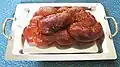 Stuffed poultry neck skin. Stuffing typically includes flour, semolina, matzo meal or bread crumbs, schmaltz, fried onions and spices. | |