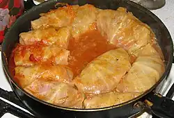 Europe | Stuffed cabbage or cabbage roll: cabbage leaves rolled around a mixture of rice and meat, baked with tomatoes |