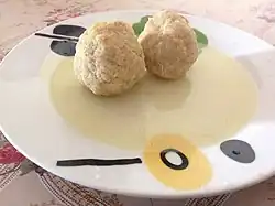 Boiled dumpling similar to pierogi or gyoza, filled with meat or mashed potatoes and served in chicken broth | |