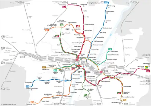 The Munich U-Bahn is a public rapid transit system serving the city of Munich and surrounding communities. The system is operated by the Münchner Verkehrsgesellschaft (MVG, "Munich Transport Company") and served over 375 million passengers per year in 2012.[1] It is made up of eight lines, running over 95 kilometres (59 mi) of route.[1]
